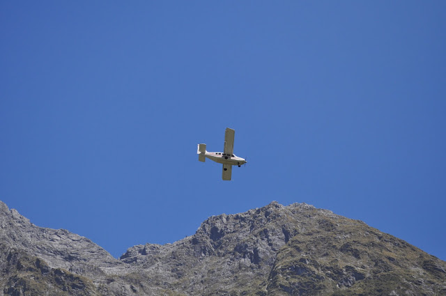 Private Airplanes flying over the river into Milford Sound.